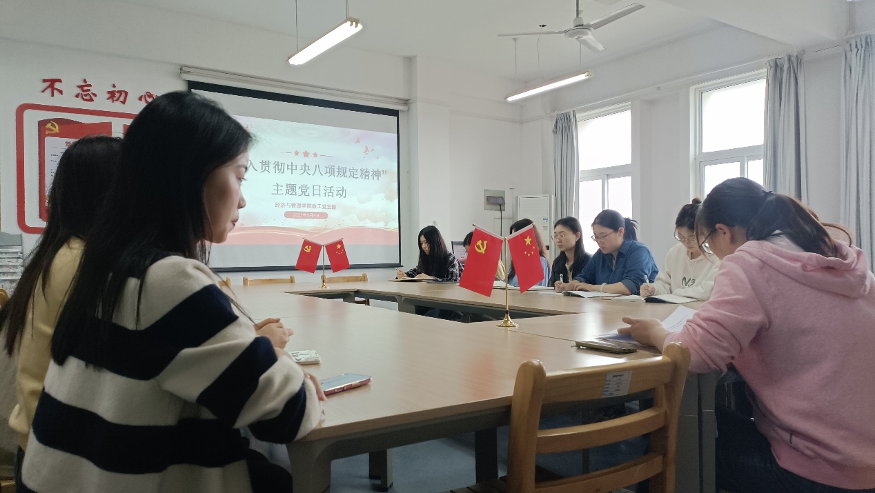 为进一步推进深入贯彻中央八项规定精神学习教育,增强教师党员的纪律意识和责任担当,5月8日下午,经济与管理学院教工党支部开展“深入贯彻中央八项规定精神”主题党日活动,活动由教工党支部书记张荣荣主持。