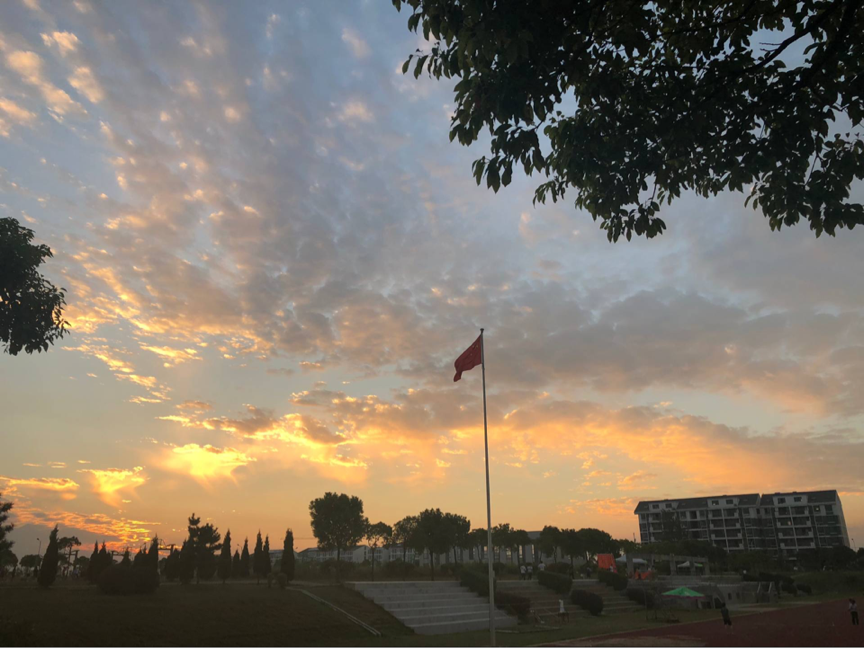 秋冬的早晨凉意袭来,道路旁的树叶也在慢慢变黄,缓缓飘落下来安静地躺在地上,校园内处处飘散着桂花的香气,红色的枫叶也为校园增添一抹色彩。傍晚的时候,城建的天空挂着成红的晚霞,湖面上的波澜也在晚霞的倒影下有了波光粼粼的景色,正是应了王勃那句“落霞与孤鹜齐飞,秋水共长天一色。”