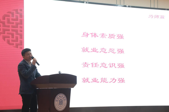 开班式上,董事长林瀚从“概况”“文化”“为师”三大篇章渐次展开一场“守初心、持恒心”的精彩致辞,为全体新教师开启了职业生涯的崭新篇章。回望来路栉风沐雨,展望前程信心满怀,董事长以“概况”开篇,指出,学校建校十六年来的不凡历程是一部沐雨栉风、勇往无前、不断进步的壮丽乐章,增强了我们继续前行的勇气和坚定实现目标的决心。他简要介绍了学校中远期发展规划,清晰勾勒出“三个五年”的奋进蓝图,指明了学校的发展方向和战略路径。浸润文化凝聚共识,内化于心外化于行,董事长以“文化”为篇,全面系统阐释了学校文化体系,围绕校徽校训的精神内核、“铜勋舰”的坚韧信念、“三扶”工程的奉献情怀、教师誓词的使命担当、工作作风的“十六字”箴言、幸福校园的价值理念等六大维度,深入阐释学校深厚的文化底蕴、真挚的人文情怀和“一心一意办好学、矢志不渝创名校”的价值追求。他强调,文化是学校的灵魂,希望全体教职工认真领会、真心认同、主动接纳学校文化基因,将其内化于心、外化于行、示范引领,共同为“有德之师、明德之生”营造良好育人氛围、贡献智慧力量。深悟师道与时俱进,矢志培育“四强”人才,董事长“为师”为核心,深刻指出,学校着力推进“身体素质强、就业意愿强、责任意识强、就业能力强”四强育人工作,是建设高质量充分就业的应用型大学和培养时代新人的必由之路,全体教职工要锚定学校“四强”育人目标,深刻领会“教师是阳光下最光辉的职业”的崇高意义。随后,他从“师道尊严”立其本、“敬天爱人”行其则、“止于至善”求其境、“与时俱进”通其变四个维度,四位一体勾勒了新时代教师“为师”的完整图景,深入阐述了“为师”的丰富内涵。他进一步指出,卓越的大学教师,应是传统师道的守护者,更是未来教育的开创者,教师要立于三尺讲台却胸怀天下,深耕专业领域却视野开阔,面对无数挑战却初心不改,唯此,才能真正无愧于“阳光下最光辉的职业”这一盛誉,在伟大的新时代,为民族复兴培育更多堪当大任的先锋力量。董事长最后以“守初心、三尺讲台重千钧;持恒心、四强育人拓新篇”的铿锵寄语作结,勉励全体教职工铭记教育报国初心,甘当“人类灵魂工程师”,勇担“立德树人”使命,共同开创高质量充分就业的应用型大学建设的崭新局面。