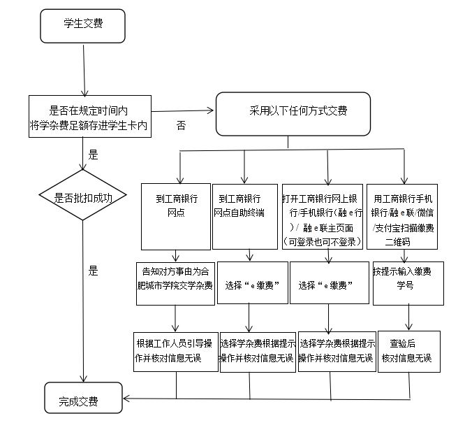 用中国工商银行手机银行/融e联/微信/支付宝扫描缴费二维码---按提示输入学号,查询核对信息后根据提示完成缴费。