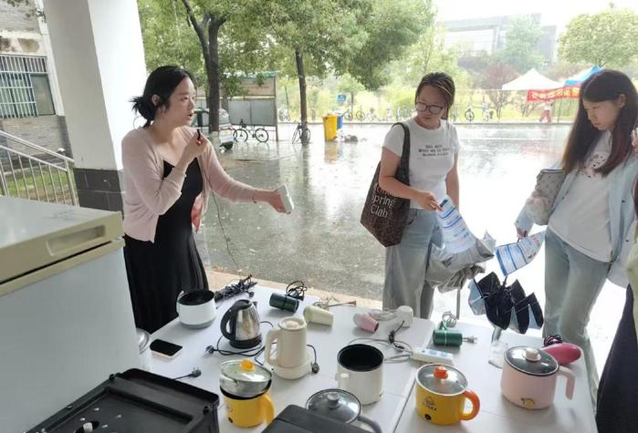 活动现场,后勤保卫处宿管中心精心布置专题展示区,创新采用“实物陈列+图文解读”相结合的方式,将宿舍安全管理规定转化为可感知、易理解的教育内容。展台上,违规电器、明火器具、易燃易爆物品及管制刀具等常见违禁品分类陈列,每件物品均配有清晰标识与风险说明,帮助学生准确识别违禁品类型、理解其潜在危害。展板区系统梳理了违禁品清单,并结合近年来高校发生的典型安全事故案例,通过“现场图片+原因剖析+后果说明”的形式,深入解析违禁品可能引发的严重后果。从“热得快”短路引发火灾,到劣质充电设备导致触电事故,一个个真实案例有效打破了部分学生的侥幸心理,显著增强了警示教育的针对性和说服力。