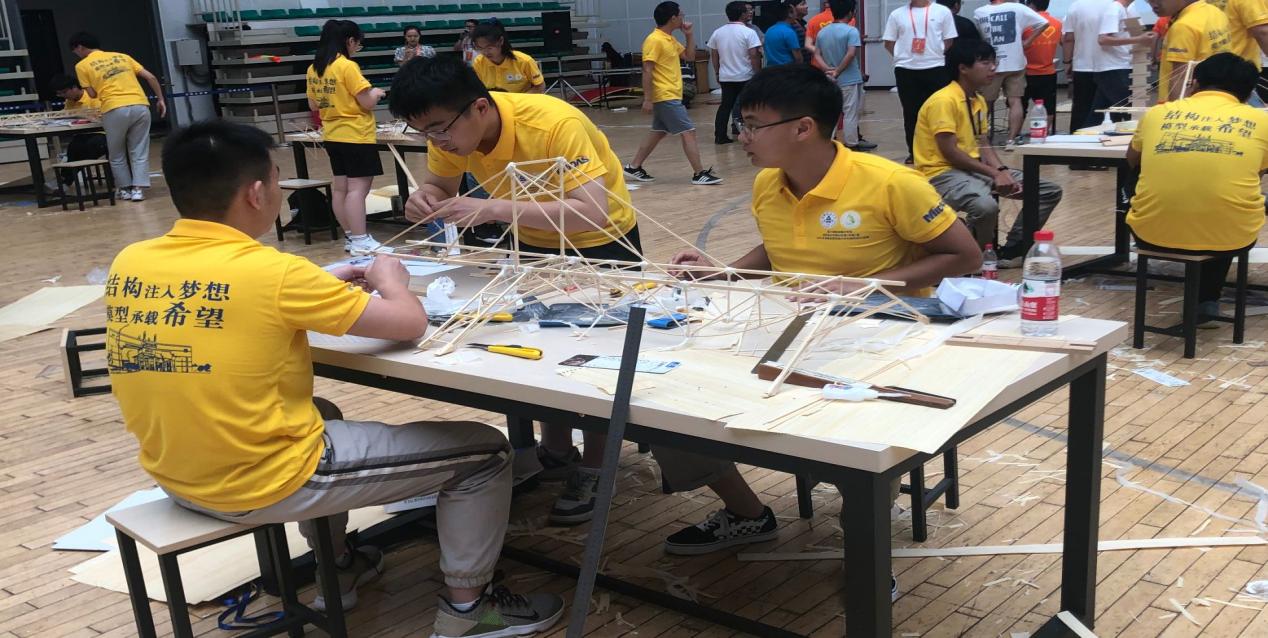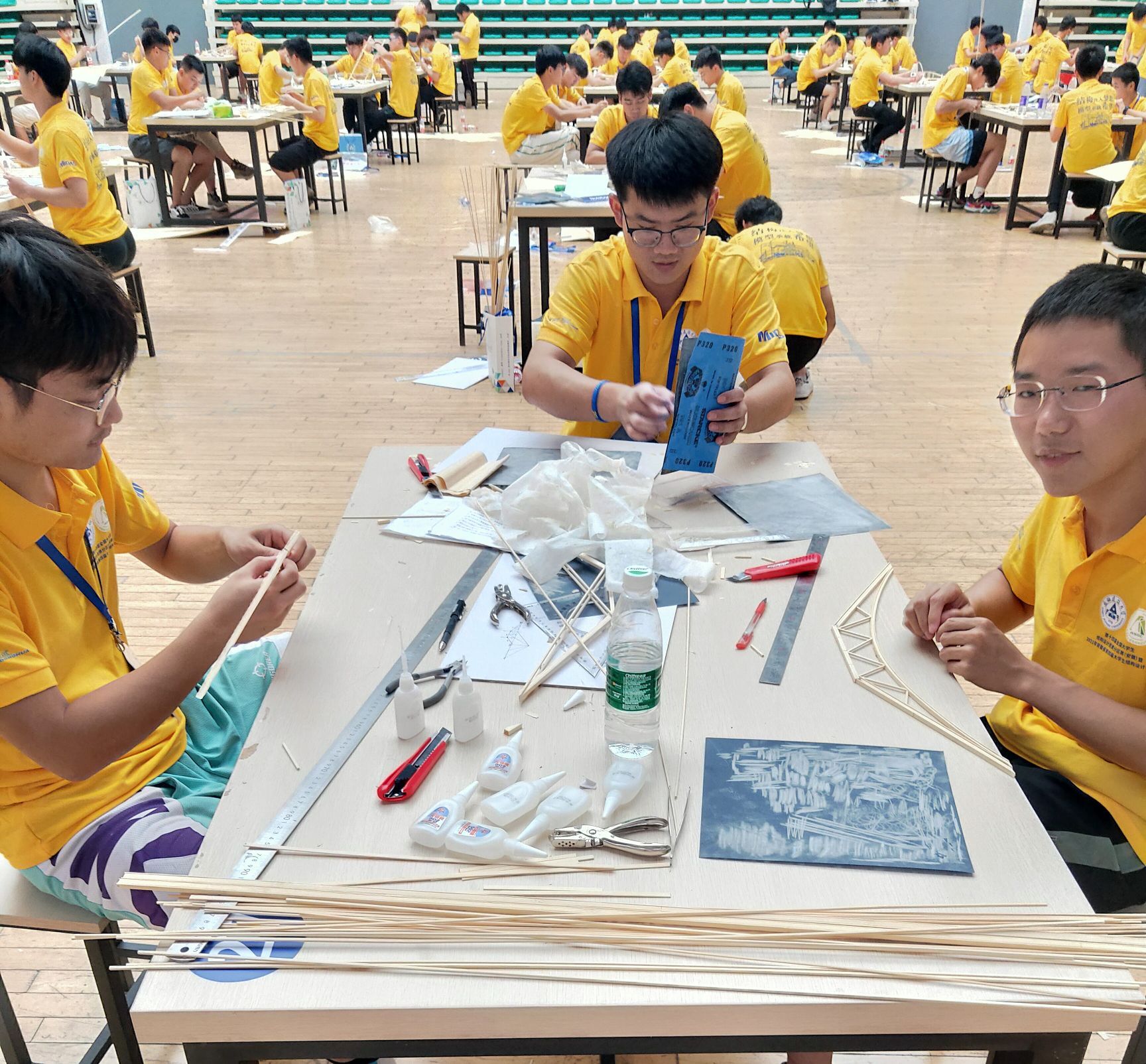 上午十点,竞赛正式开始。竞赛共分为两个场地,分别设在篮球馆和乒乓球馆。全体参赛队伍进入各自场馆后,需先进行各队材料质量检查,发现问题并及时更换。上午十点半,全体参赛选手均须在各自的制作台上开始制作模型,不得擅自交流。紧张热烈的气氛感染着赛场上的每一个人,每一支队伍都认真且专注,我院三支代表队伍也未曾落后,他们分工明确,从容不迫。经过两天的比赛进程,6月26日下午四点,全体参赛队伍提交模型,离开场地。各专家评委对每一支参赛队伍制作的模型进行称重记录及违规判定。