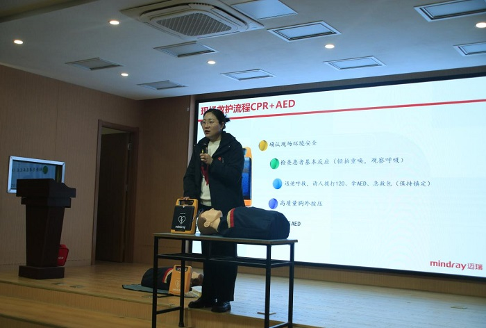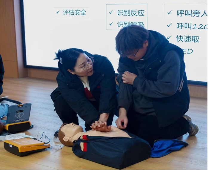 张老师详细讲授了心脏骤停的概念、急救行为的重要性、基础心肺复苏术的原理及操作方法。在让同学们了解急救知识与技术原理的基础上,张老师又重点讲解并演示了胸外心脏按压技术、人工呼吸方法和使用自动体外除颤器AED的动作要领。