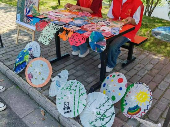 油纸伞制作和大漆团扇绘制环节更是将活动推向了高潮,同学们在绘制油纸伞和制作大漆团扇的过程中,展现出了极高的热情和专注。绘制油纸伞时,他们手持画笔,在伞面上勾勒线条、填充色彩。而制作大漆团扇则更考验同学们的耐心和技艺。同学们精心挑选合适的扇子,为团扇上色,让扇面呈现出光滑细腻的光泽。在同学们的巧手创作下,这些物品宛如凤凰涅槃,蜕变为满载艺术韵味与创意灵魂的美好事物。