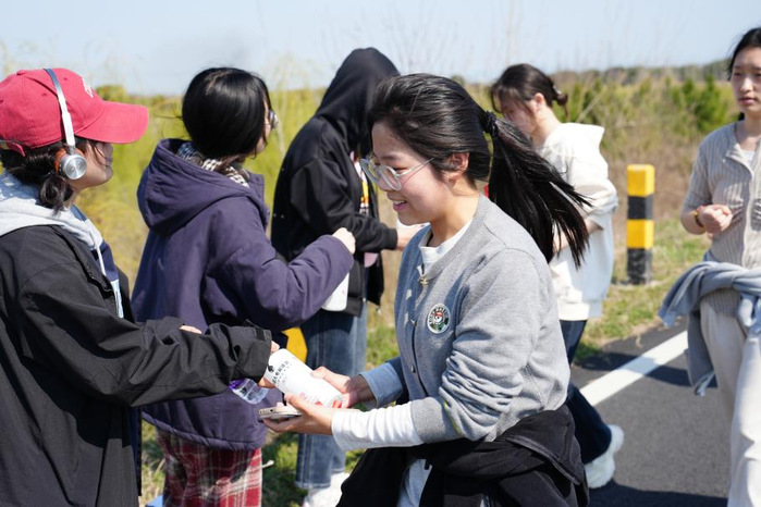 下午一点整,参与环湖跑的同学已在校门口集合完毕。在工作人员的有序组织下,大家领取了象征活力与热情的“混天绫”,并将其绑在手上,红色的“混天绫”丝带为活动增添了一抹亮丽的色彩。随后,工作人员带领同学们一同前往十公里起点处,一路上,大家欢声笑语不断,对即将开始的十公里挑战充满了期待。