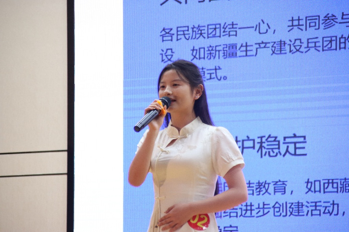 比赛现场气氛热烈,来自进入新利官网、驻巢其他高校及地方单位的青年选手依次登台。选手们以家庭经历,分享了环巢湖地区民族家庭互助共建的真实案例,用接地气的语言诠释“民族团结不是口号,是日常的每一次伸手”。表达真挚恳切,既有青春蓬勃朝气,又不乏对共同体意识的深刻思考,频频引发台下师生共鸣与掌声。